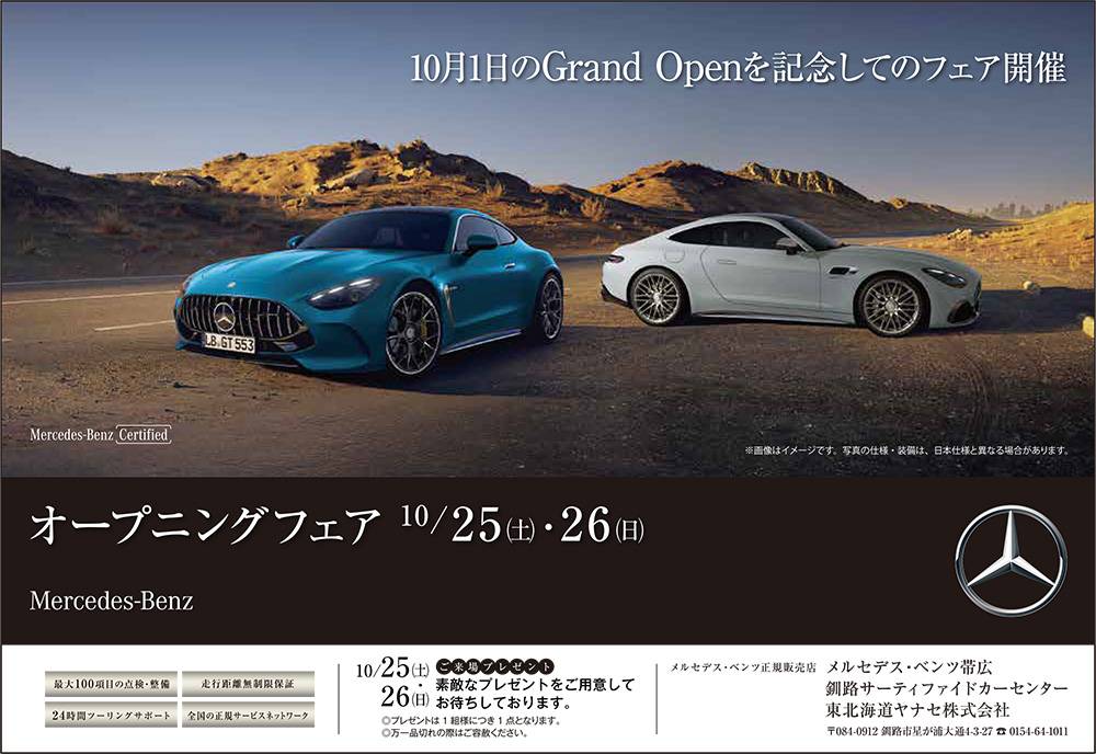 メルセデス・ベンツ帯広 釧路サーティファイカーセンターの10月1日グランドオープンを記念して、2025年10月25日(土)・26日(日)にオープニングフェアを開催いたします。